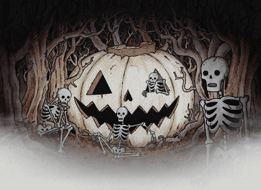 A group of skeletons loiter around their giant rotting pumpkin in the dark woods. They're waiting for the light to flicker in its eyes again, waiting until the veil between worlds grows thin once more and they can go on the prowl in the land of the living. Until then they might be a little bored...